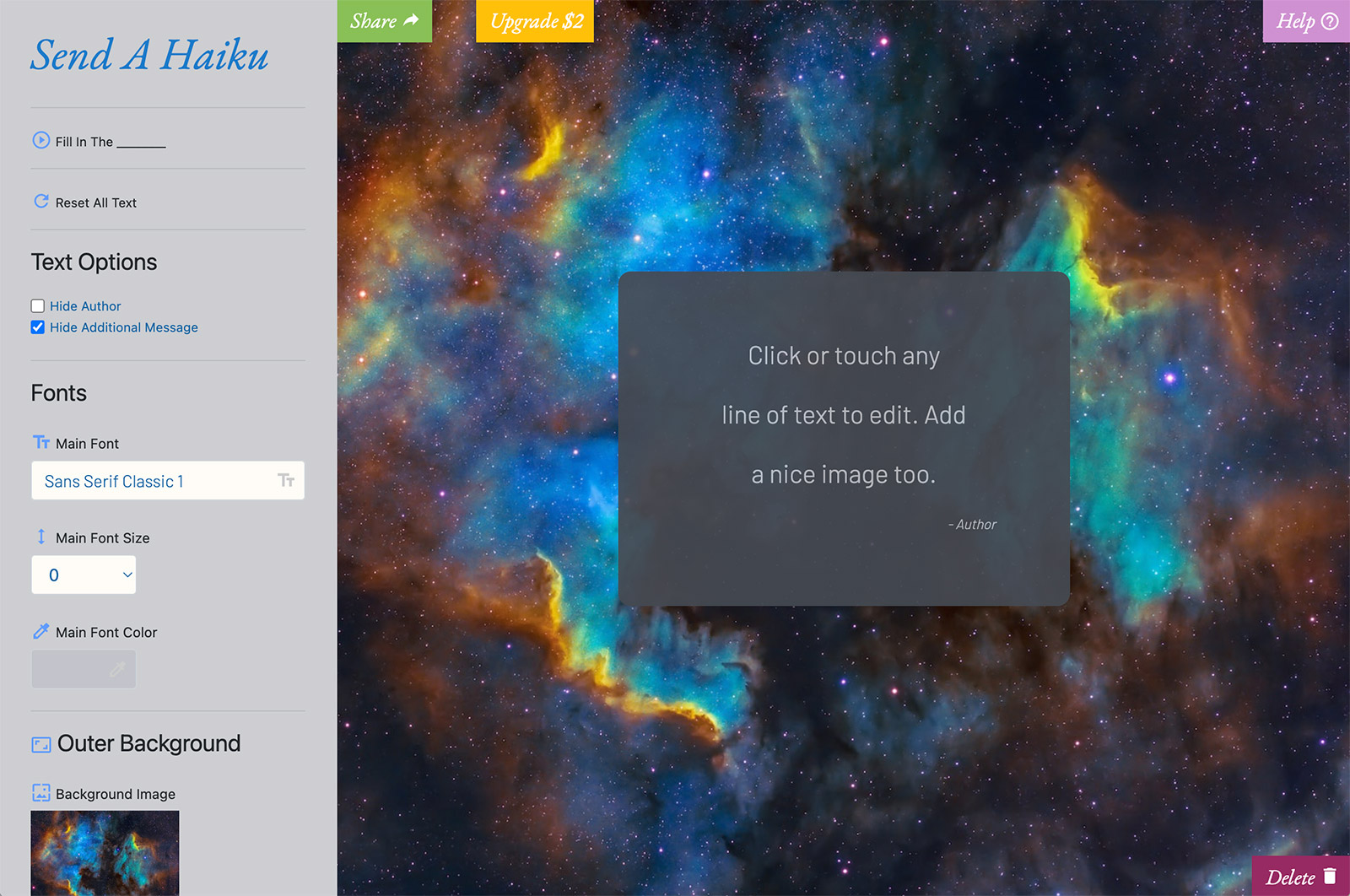 Send A Haiku is a dynamic and creative haiku greeting card builder. Share a private haiku with someone special, or make your haiku public for everyone to see.