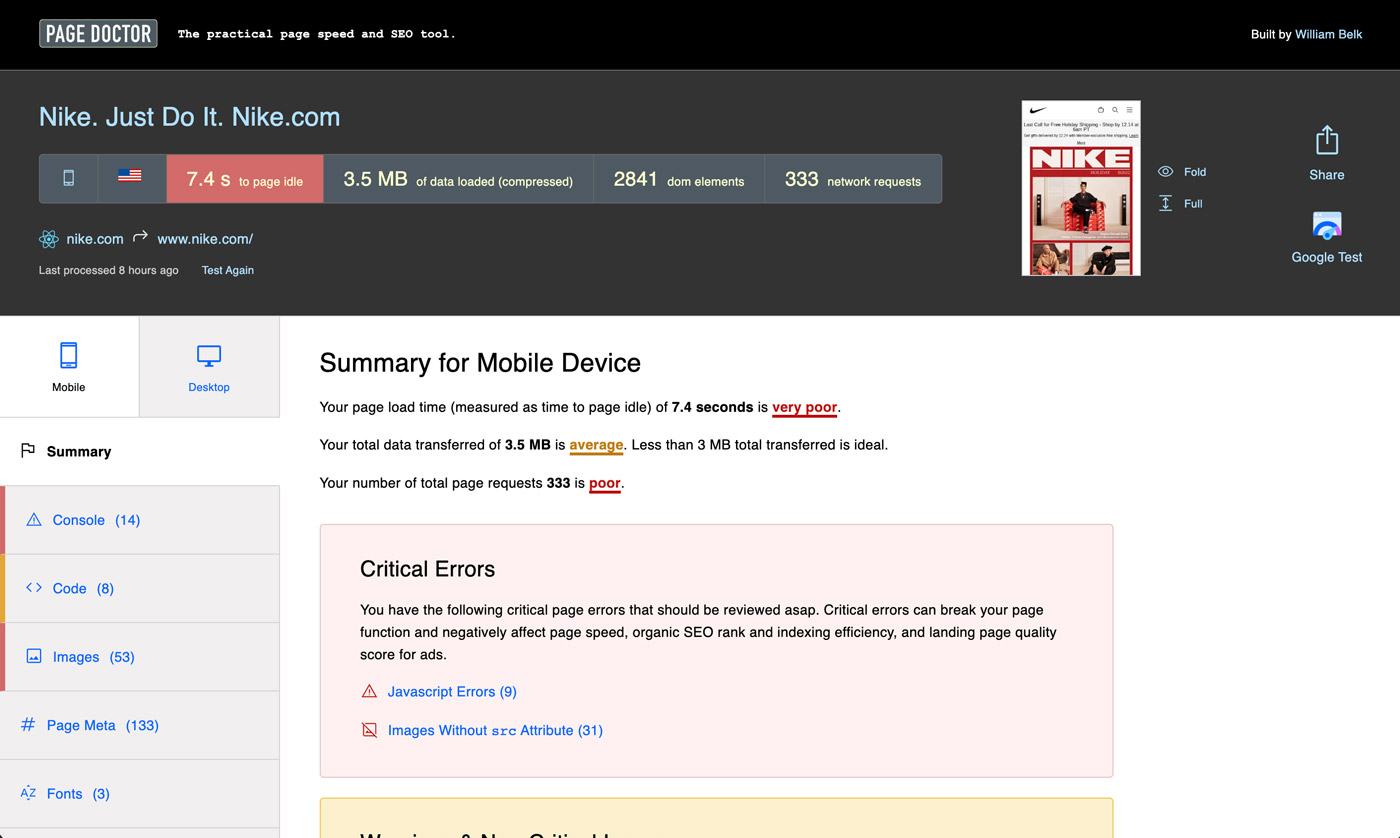 Page Doctor helps you streamline the preliminary page analysis stage for page speed and SEO optimization. Page Doctor offers a unique lens into code quality and best practices — a view that is hard to find with a single tool.