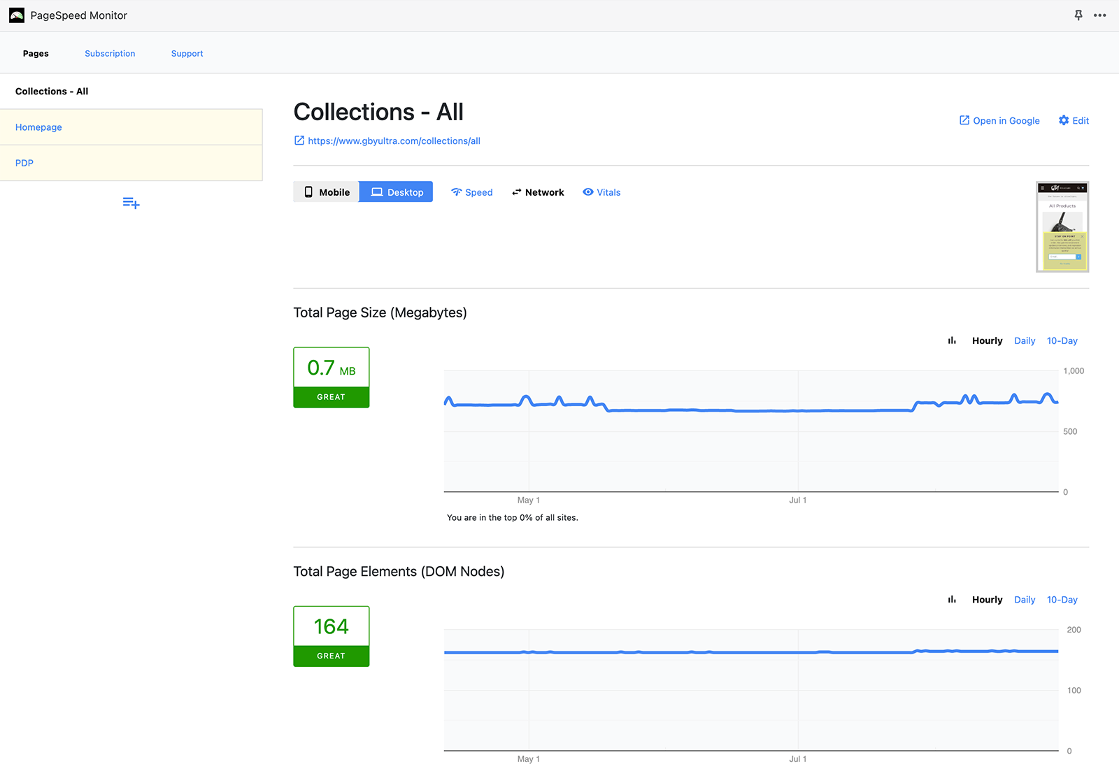 PageSpeed Monitor tracks web vitals data associated with Shopify theme pages from Google PageSpeed Insights. Tracking web vitals helps to keep track of important measures like Cumulative Layout Shift (CLS) and Largest Contentful Paint (LCP). These measures are Google Search ranking factors.