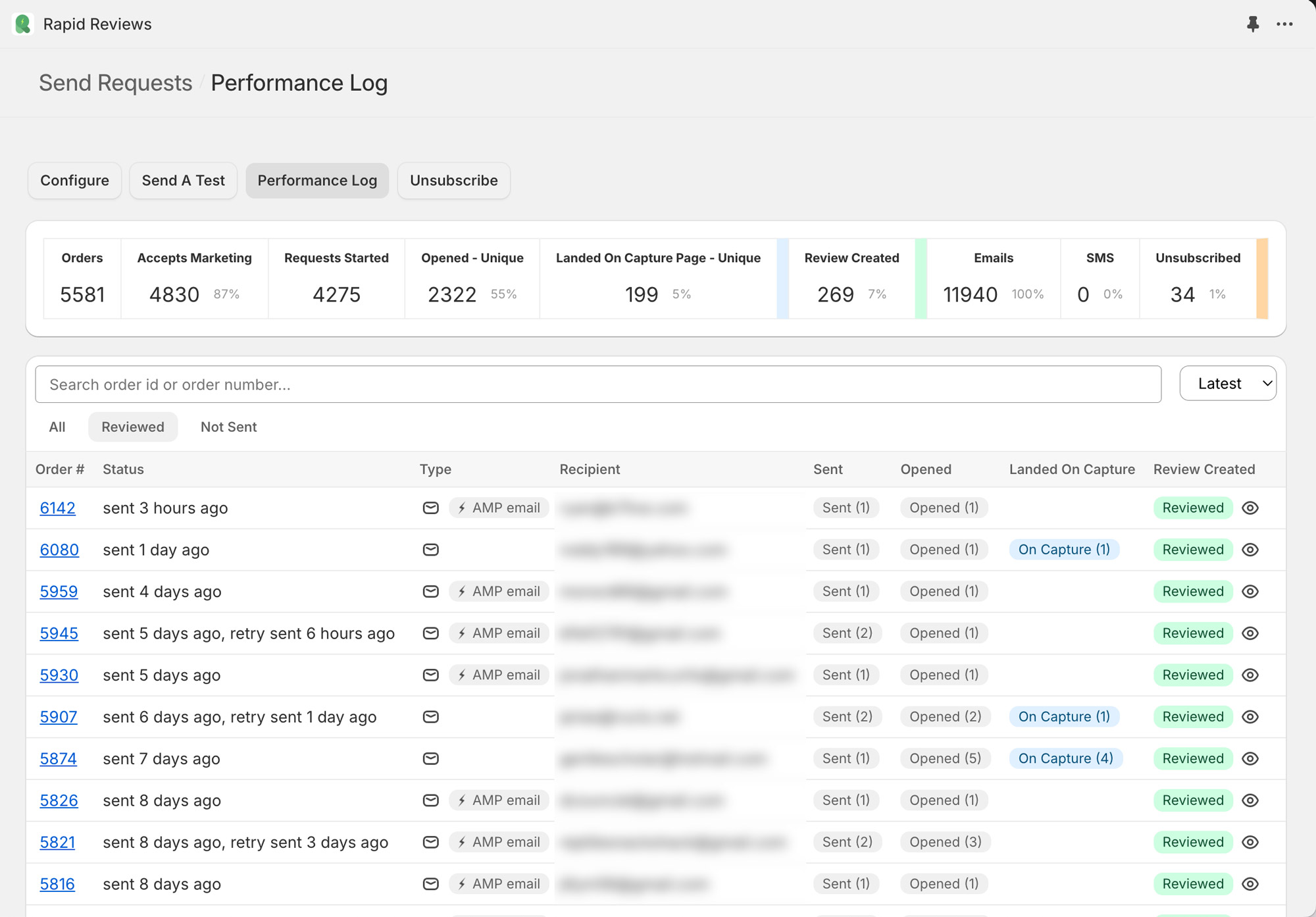 Our powerful tracking lets you keep an eye on your performance with sends, opens, landing page views, reviews created, unsubscribes, and marketing status of the customer associated with each order.
