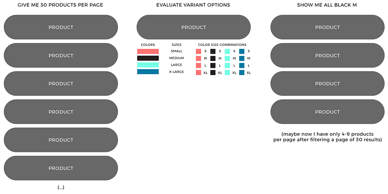 By default, Shopify data calls (either in liquid or via API) return just products with their associated variant data. It is not possible to ask Shopify “show me all black in size M”. In order to understand what is happening across all product variants, i.e. grouping variants by things like color and size—one must look through each product and create groups of variants within each product parent, or build separate collections of data for all black, all size M, and their intersections. In order to say “show me all black in size M” with just Shopify’s liquid or API, one must look through all products with product.variant option_n contains black then filter out results. Simple right? But what about pagination? And what about the fact that we can’t store these evaluations anywhere. We start to end up with uneven numbers of filtered entities in each page. The visitor experience gets slow, memory-bound, wonky, and it all just looks unprofessional—i.e. not good for the visitor.
